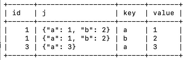 | json_each | JSON オブジェクトのトップレベルの要素をキーと値のペアに展開します。 | SELECT * FROM tj_test, LATERAL JSON_EACH(j); | !json_each |